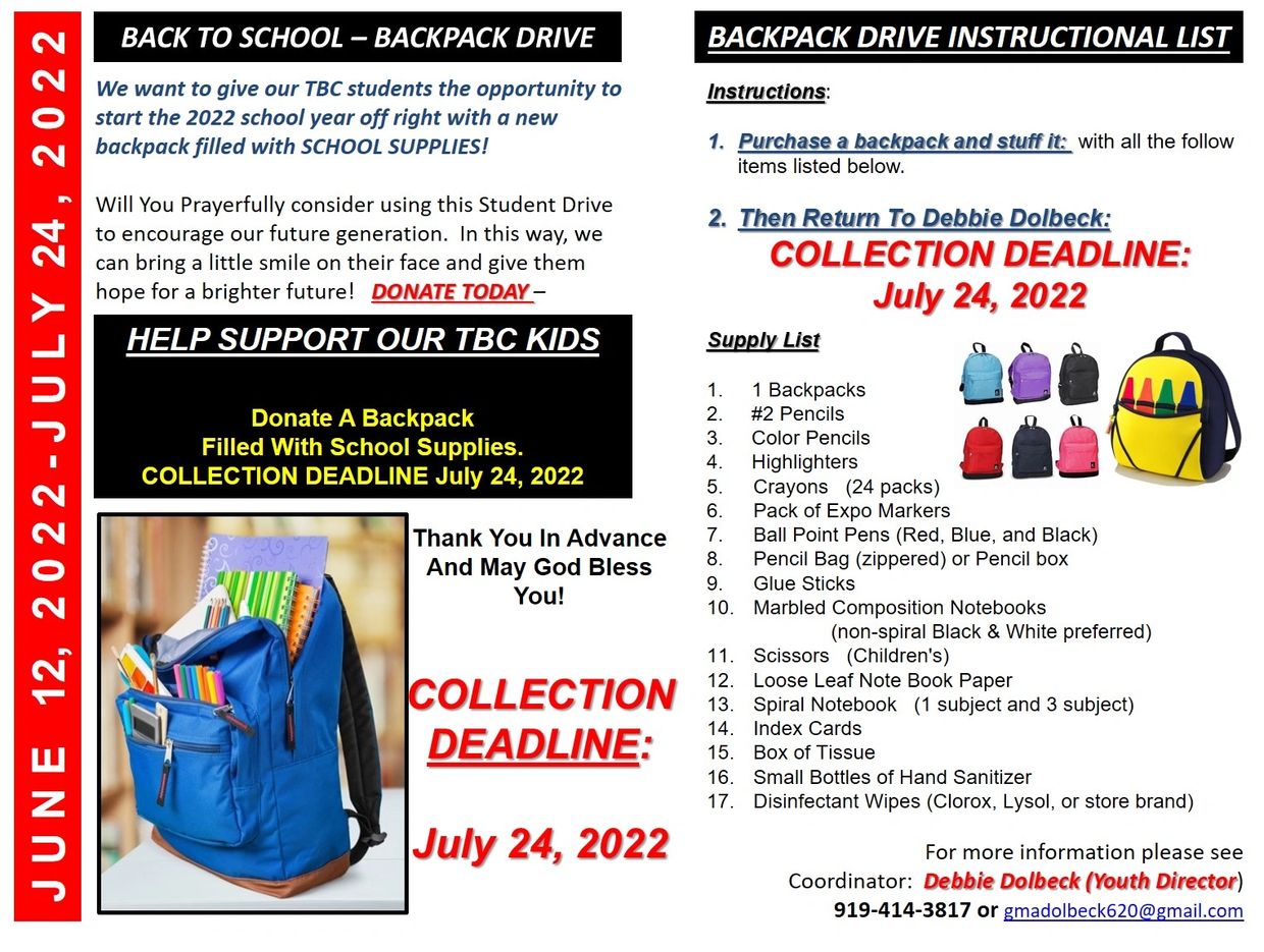 Please purchase a backpack, or the list of supplies for a backpack, or both and submit them to Debbie Dolbeck by Deadline. This is greatly appreciated by the kids who are not fortunate to be able to secure supplies.